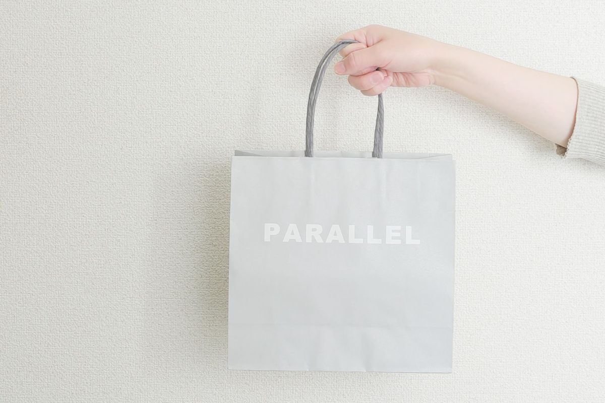 紙袋はこんな感じ(無料)。淡いグレーが上品で、手渡す際にもセンスが感じられ、喜んでもらえそう。