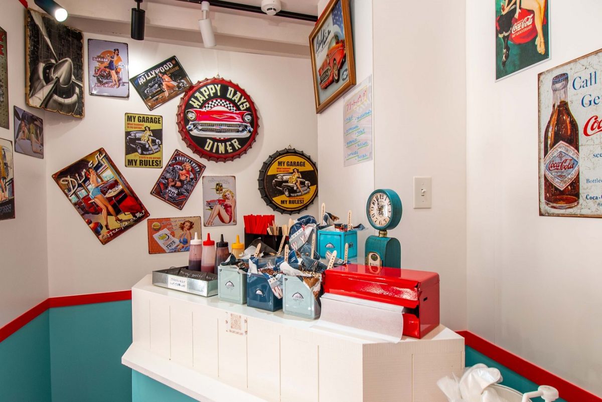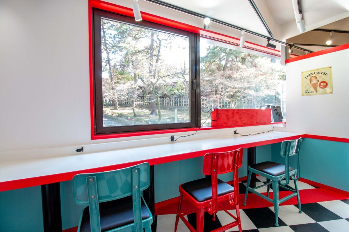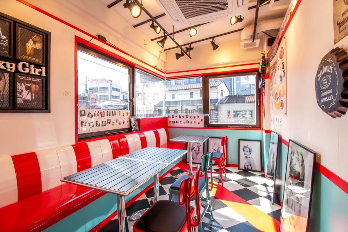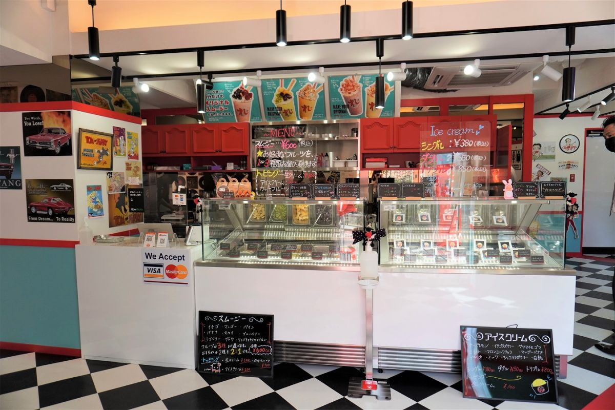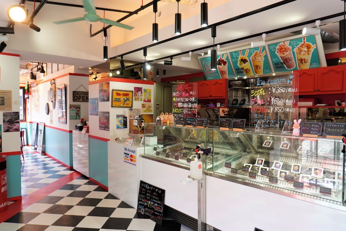 京都らしい祇園の町並みから、アメリカンダイナーの世界にワープしたような、ワクワク感が感じられます。ショーケースには、おいしそうなカットフルーツとアイスクリームがずらり。