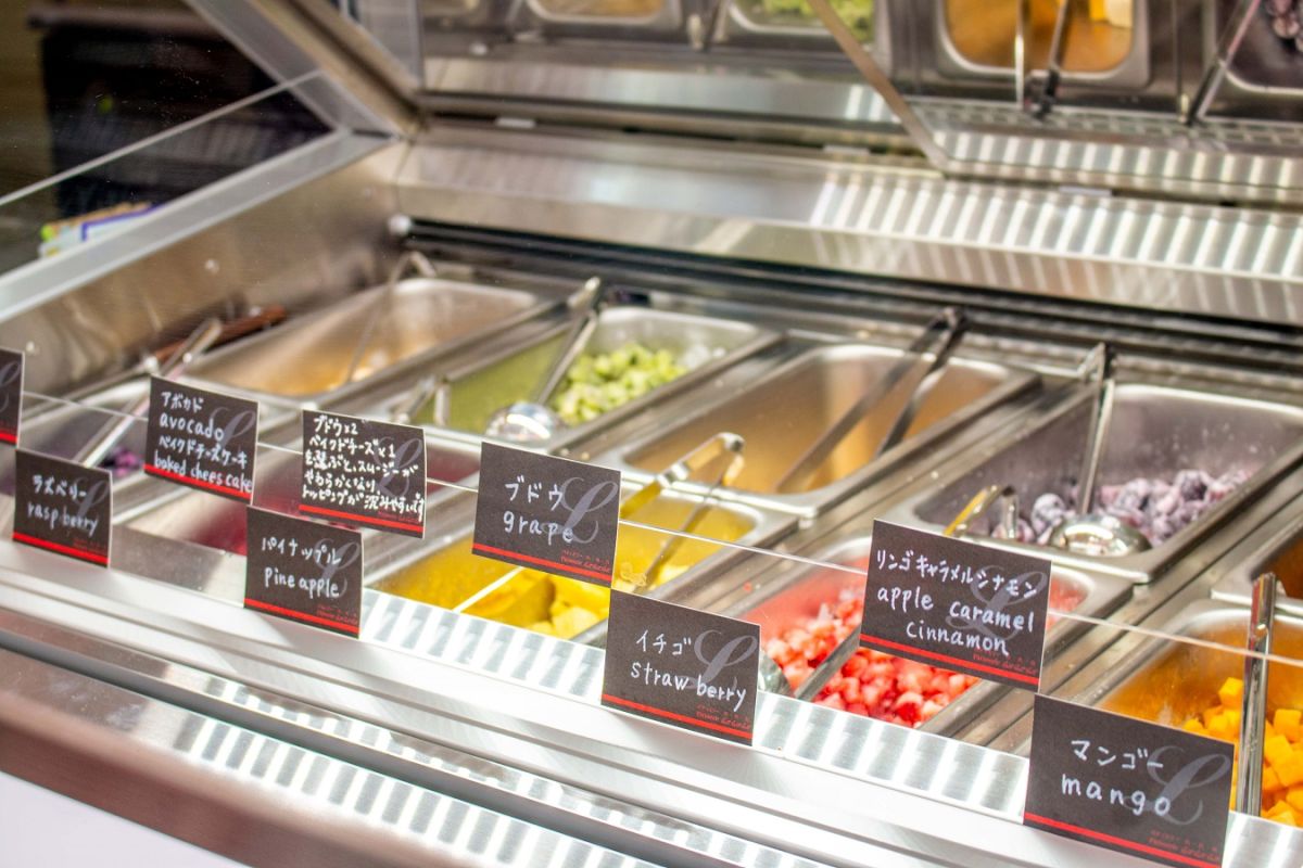 カップアイスにも、生クリームやカットフルーツ、ベイクドチーズケーキなどのトッピング(各100円)OK。スムージー同様、フリートッピングスペースでのカスタマイズも楽しめます。