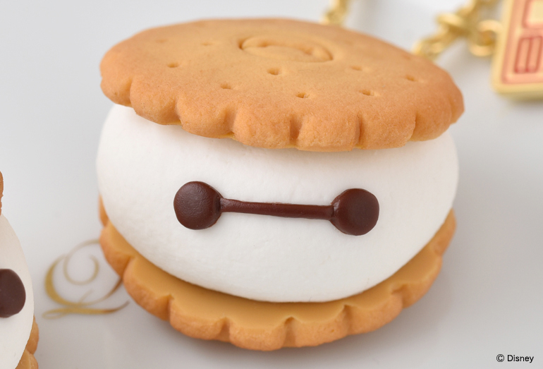 最高にキュートなルックスに心奪われる「スモアサンド」は、マシュマロに見立てたふわふわの『ベイマックス』をおいしそうなビスケットでふんわりサンド。ネックレス1万1500円、バックチャーム9350円で登場します。