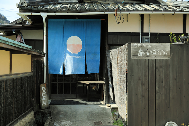 店へは、こんもり盛られたご飯が描かれた青い暖簾(のれん)を目印。本村地区には、ほかにもすてきな暖簾を掛けている家が多いので、ぜひチェックしてみてください。