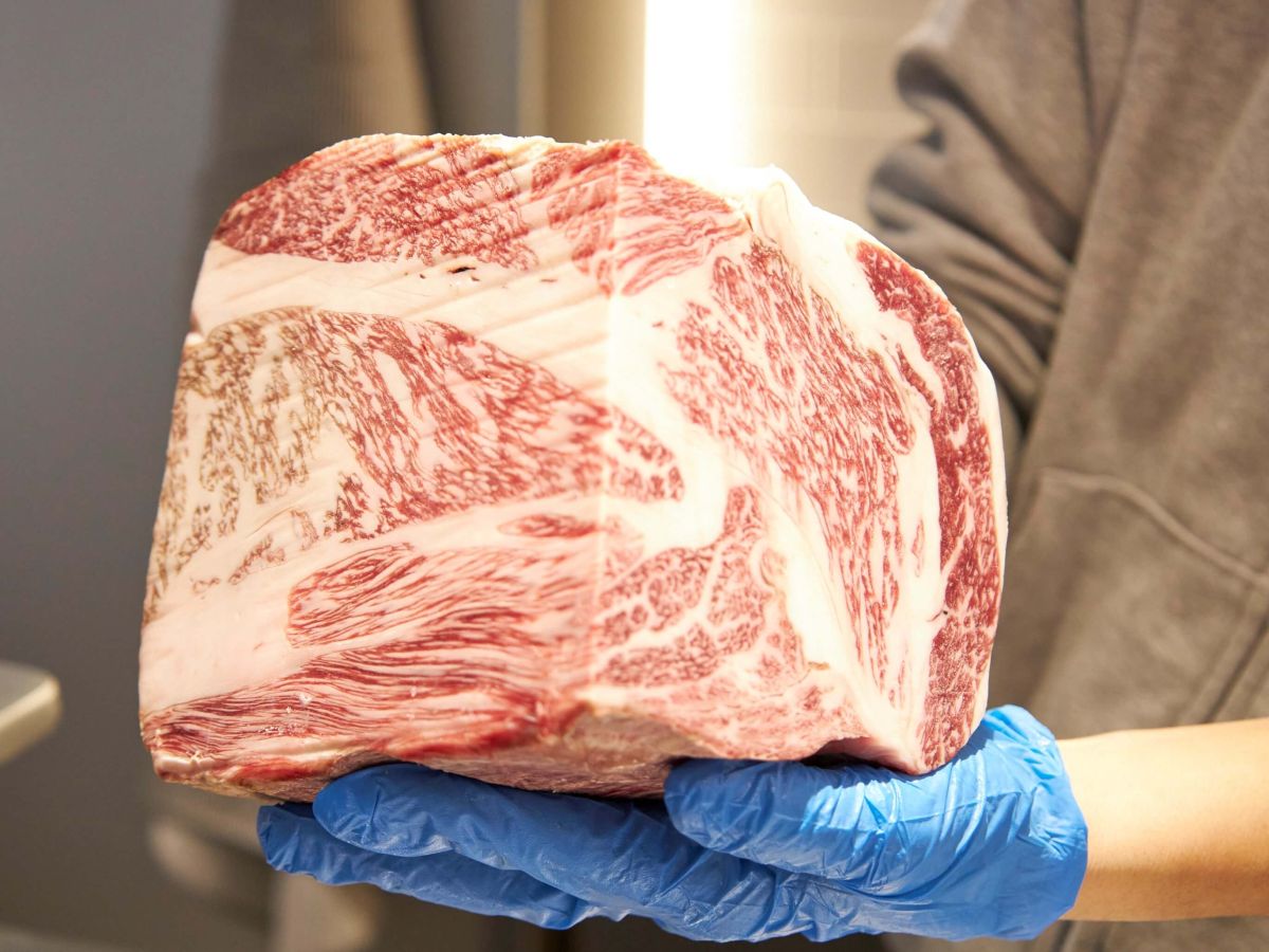 今手にしているのは、独自の熟成法で風味を極限まで強くさせたという「熟成黒毛和牛」のロース(今回オーダーしたもの)です。香り豊かでコラーゲンたっぷり。お店自慢のお肉のひとつです。