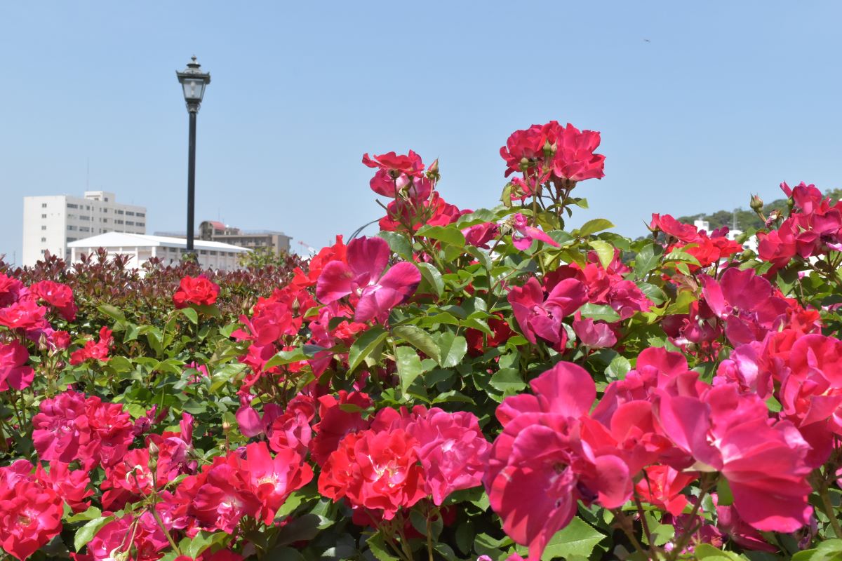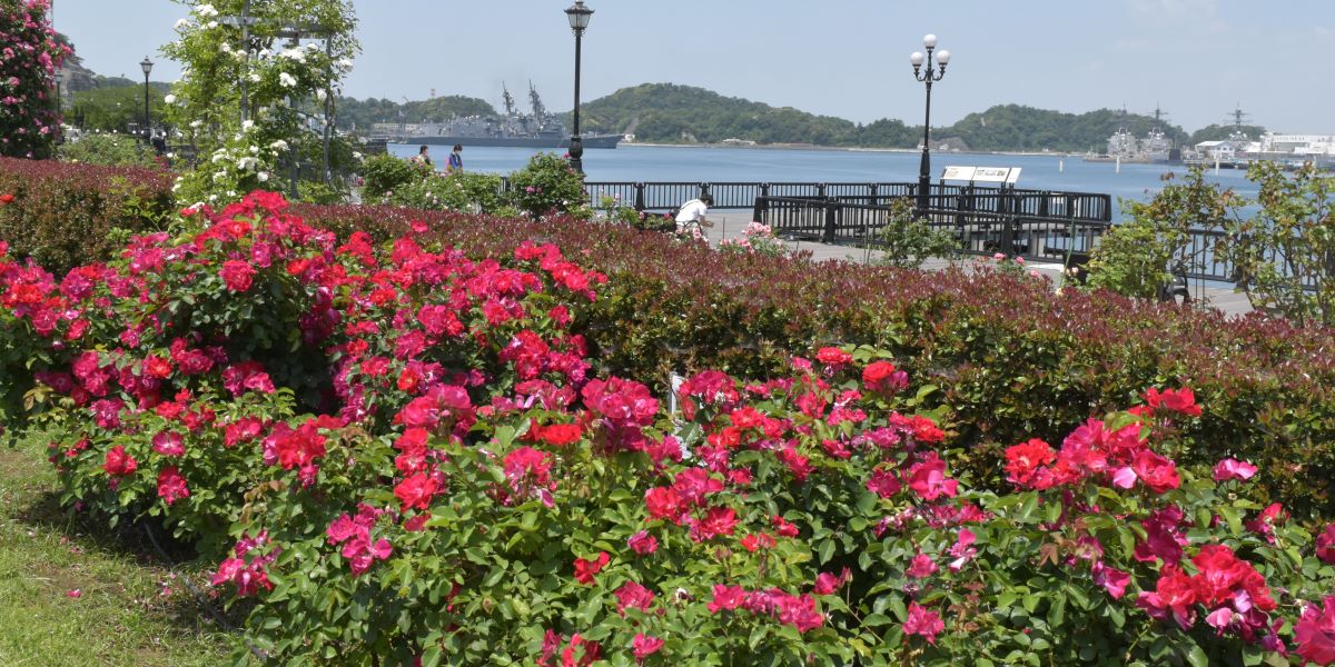 横須賀市ヴェルニー公園は、横須賀港に面し、約160種類1700株のバラを楽しむことができるフランス庭園様式をもつ公園です。毎年5月下旬に「春バラ」が見頃を迎え、入園無料で楽しむことができます。