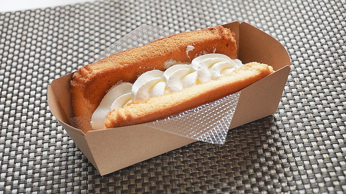 半透明のパッケージから取り出すと、厚紙の容器のなかで、分厚いカステラがゆるーく丸められ、その間にたっぷりのホイップクリームがサンドされているのが見えます。エアリーな台湾カステラが潰れてしまわないように、厚紙容器でしっかりガードされているのです。