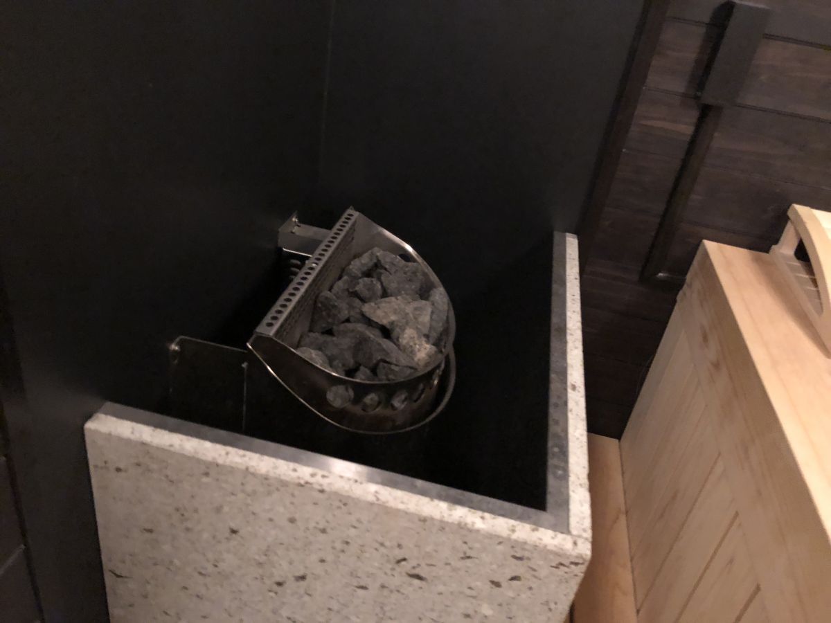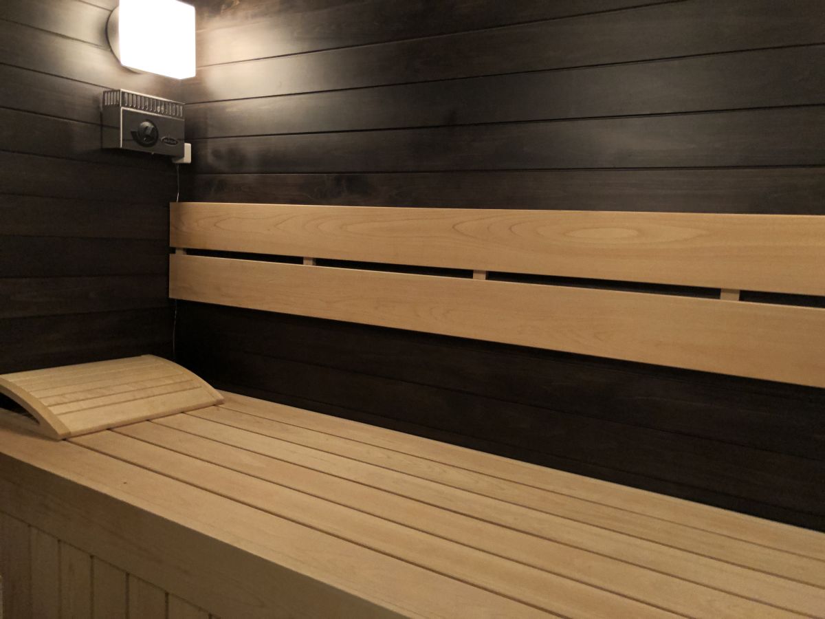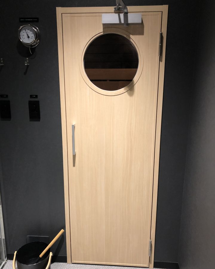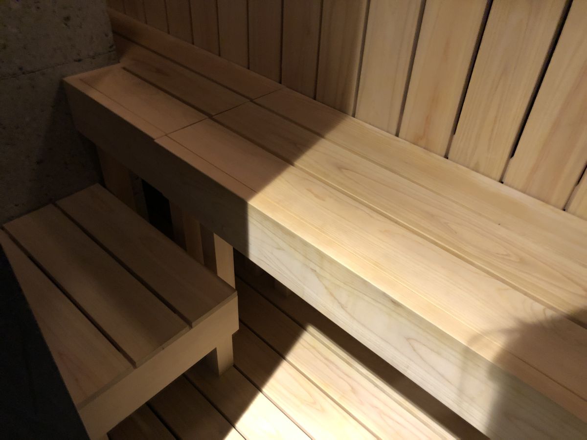 サウナでは1段の席の差で約10度ほども温度が変わるとのことで、サウナ好きはこぞって一番熱い上段に座るのだとか。そんなサウナ好きの思いに応えるために、サウナ室の高い温度を存分に感じられる最上段のベンチが窮屈にならないよう何度も設計を繰り返ししたそう。ステップがあるので女性でも楽々上れますよ。