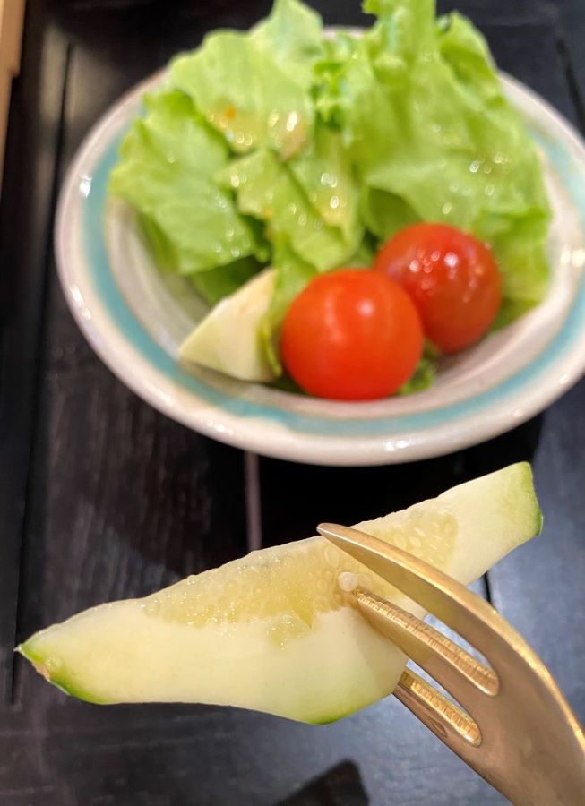 珍しいのがサラダに入っていた子メロン。静岡県産の高級マスクメロンを生産する際、ひとつの果実に甘みと栄養を凝縮するため、ほかの果実は「摘果(てきか)」されます。その摘果されたメロンが子メロンなんです。甘みはあまりないため、野菜のような使い方がおすすめなんだとか。初めて食べましたがそのまろやかで風味豊かな味わいは驚きでした!