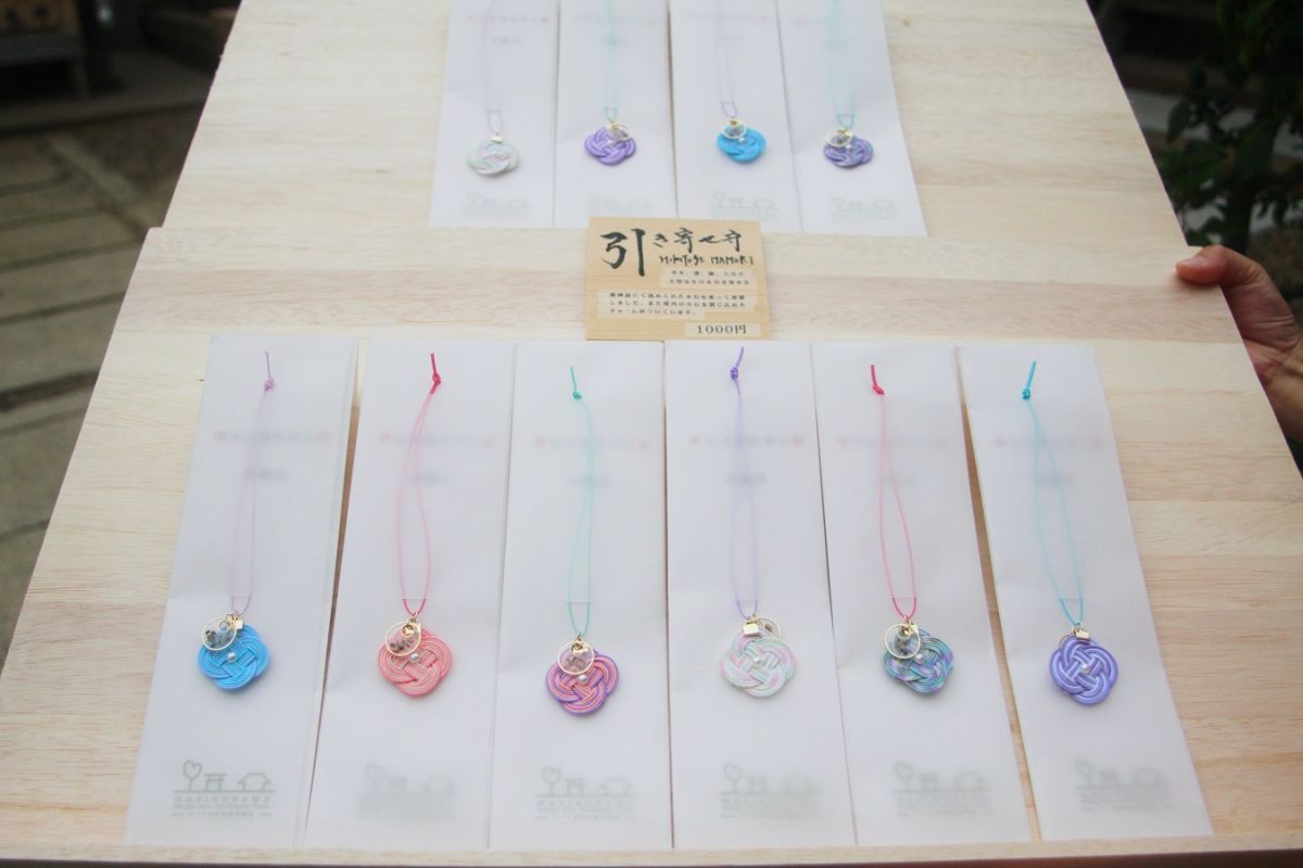 同じく「ついたちまいり」限定の「引き寄せ守り」も人気の授与品のひとつ。こちらは神前で清められた水引に、境内の小石をあしらったチャーム付きのお守りです。