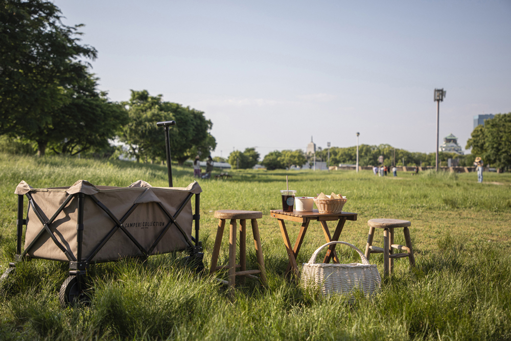 難波宮跡公園に到着したら、好みの場所にセッティング。ピクニックセットがおしゃれだから、並べるだけでフォトジェニックなシチュエーションのできあがり。