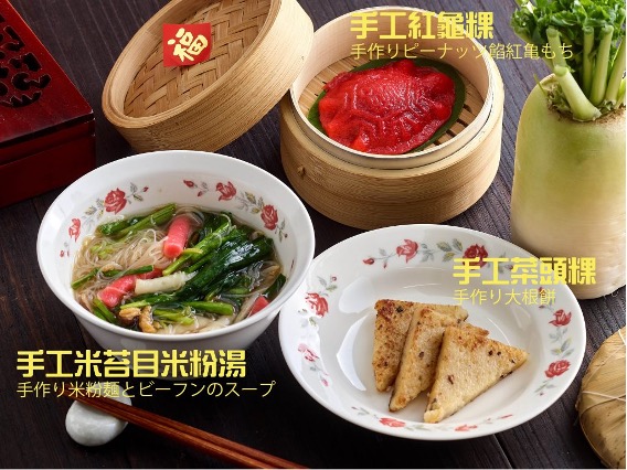 メインは、米粉を使った手作り太麺「米苔目」と新竹ビーフン、食感の異なる2種類の麺をカツオだしで味わう「手工米苔目米粉湯(手作り米粉麺とビーフンのスープ)」。副菜として、台湾・高雄産の干しエビと台湾南部・ホリ産のシイタケを使ったモチモチ食感の「手作り大根餅」と、粗びきピーナッツ餡が入った長寿吉祥のお祝いやお供えモノに欠かせない「手作りピーナッツ餡の紅亀餅」の計3品。まるで台湾旅行かのような気分になれちゃいます♪