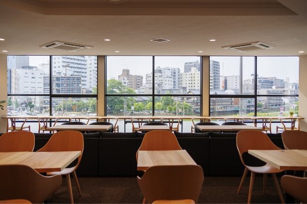 約70席の広々とした店内にはソファ席、カウンター席などさまざまなタイプの席が揃います。特におすすめなのは、鴨川や五条大橋など、京都らしい風景を眺められるカウンター席。