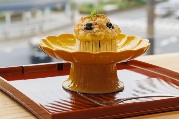 こちらはFufuマフィン550円。豆乳や生のおから、焼き麩などを使ったふわふわの生地の中に、甘酸っぱいブルーベリーや、ザクザク食感のココナッツのクランブルが入っています。バターや卵、白砂糖は不使用だそうですが、そうとは思えないぐらいふわふわしっとり!ちなみにマフィンのフレーバーはチョコバナナ、ゆずなど日によって変わるそう。取材時(2022年5月中旬)はイートインのみですがテイクアウトも考えているそうです。