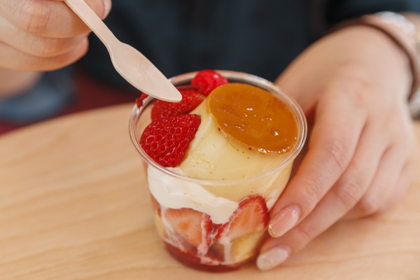 「カステラ・プリンア・ラ・モード」は530円。米飴とメープルシロップを使ったカステラの上に、昔ながらの固めプリンがどーんとのっています。季節のフルーツと生クリーム、フルーツソースでデコレーションされていて華やか。プリンは甘すぎないので、見た目よりもあっさりといただけますよ。