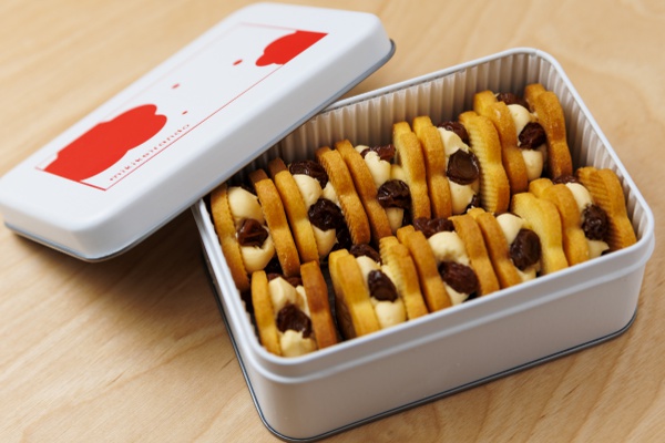 お土産にぴったりの焼菓子も揃っています。「レーズンバターサンド10個入り」2500円は、アーモンドの香りが漂うサクサクのサブレに、コクのある卵黄を使ったバタークリームとラムレーズンをサンド。バタークリームはまろやかで口どけが良く、老若男女問わず評判です。個包装された5個入り1200円もあります。