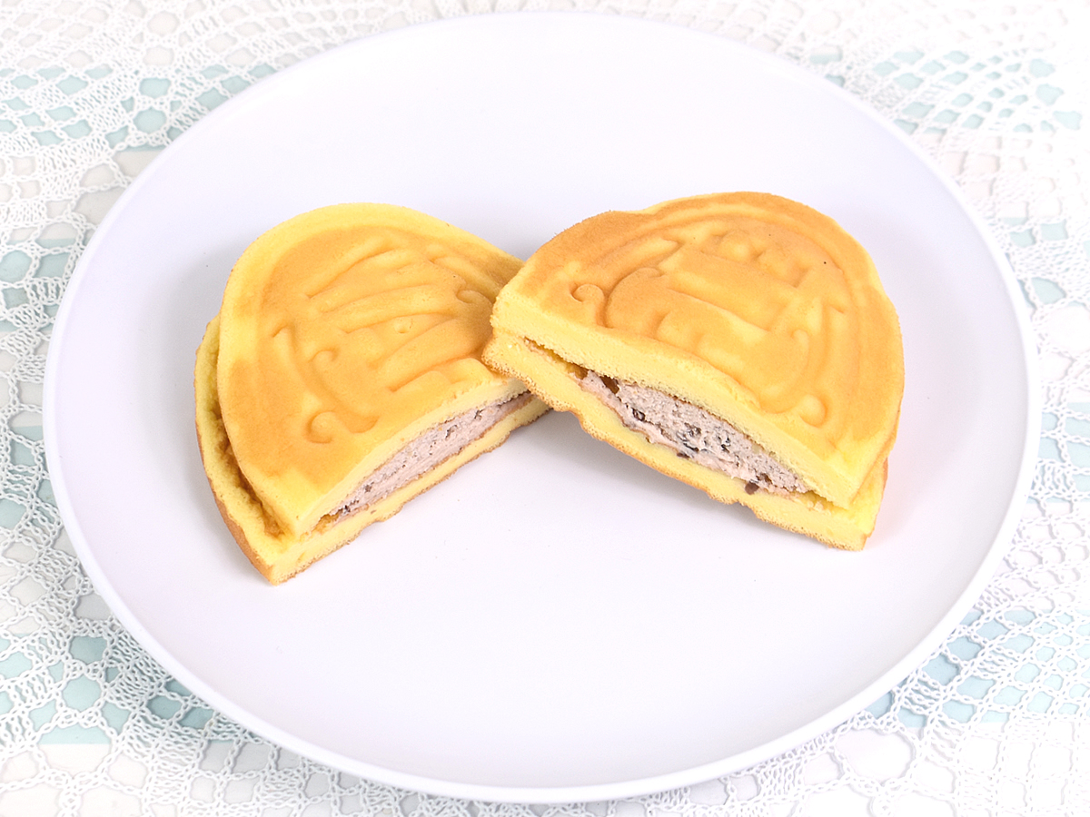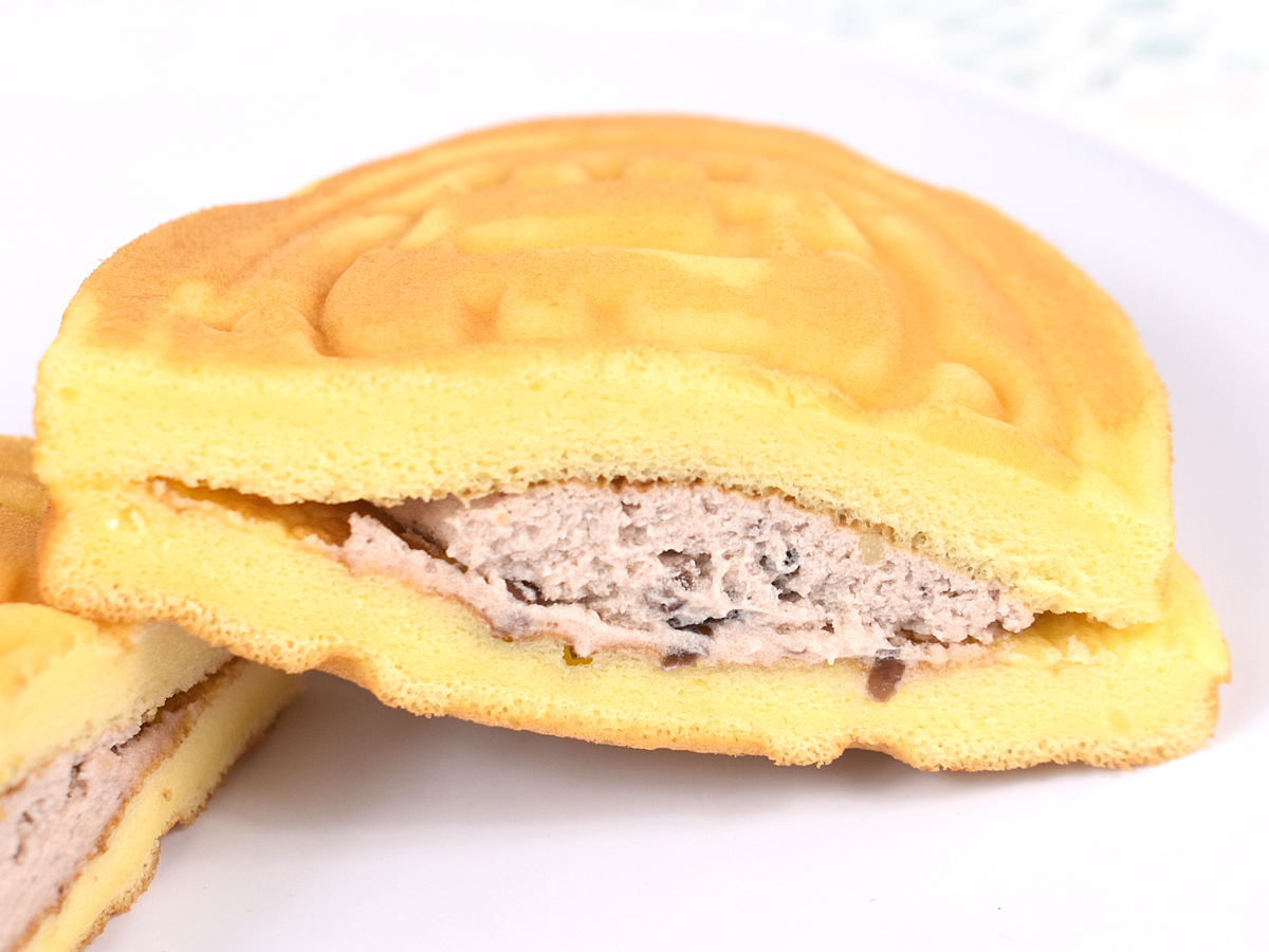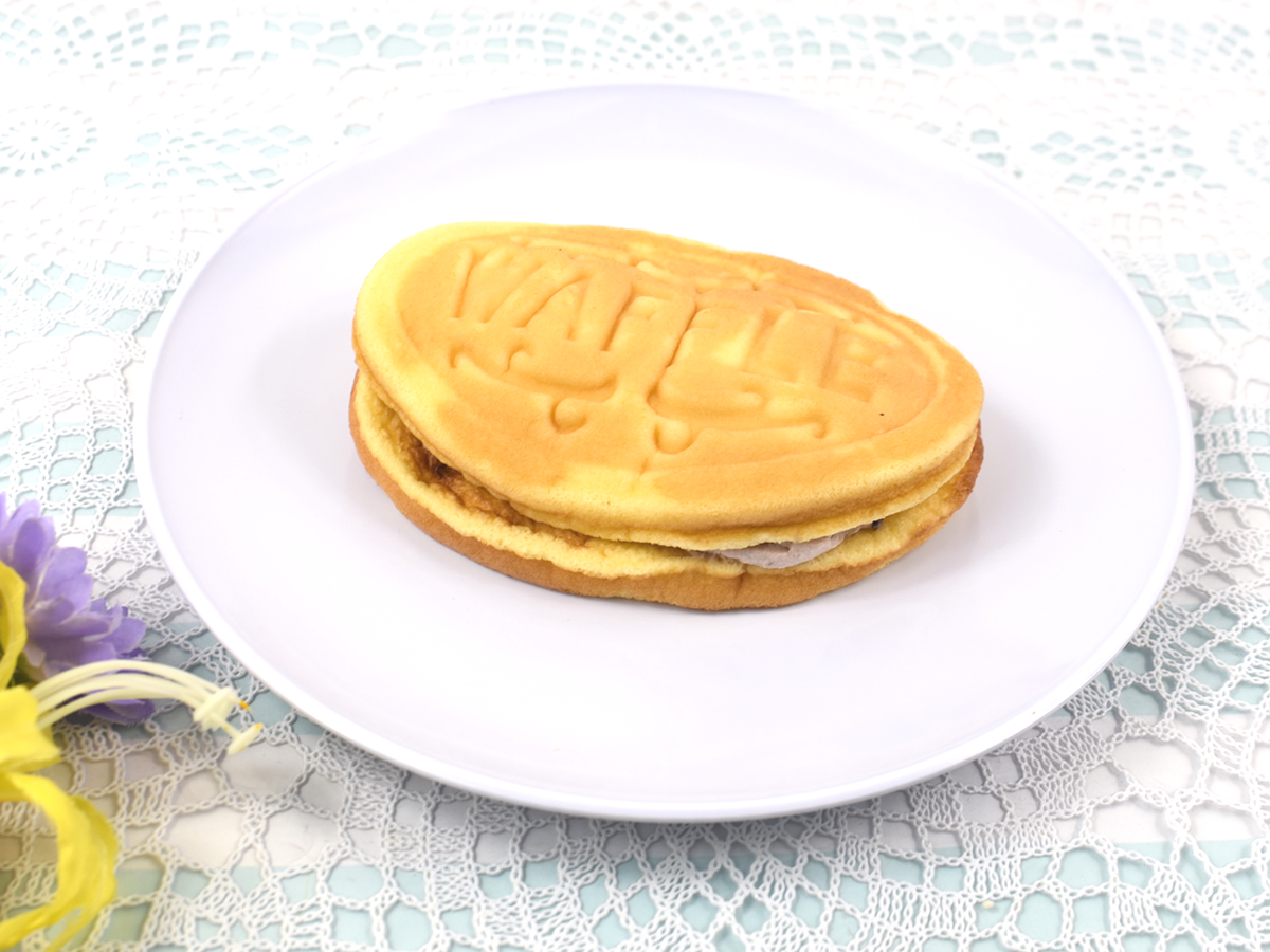眼鏡をかけた男性のイラストがかわいらしいレトロ調のパッケージを開けると、ワッフルはやや大きめ。手のひらほどのサイズがあるので、食べごたえ十分そうです。ワッフルの間には優しい小豆色のクリームがたっぷりサンド。袋を開けた瞬間からバターの濃厚な香りが漂ってきて食欲をそそります。
