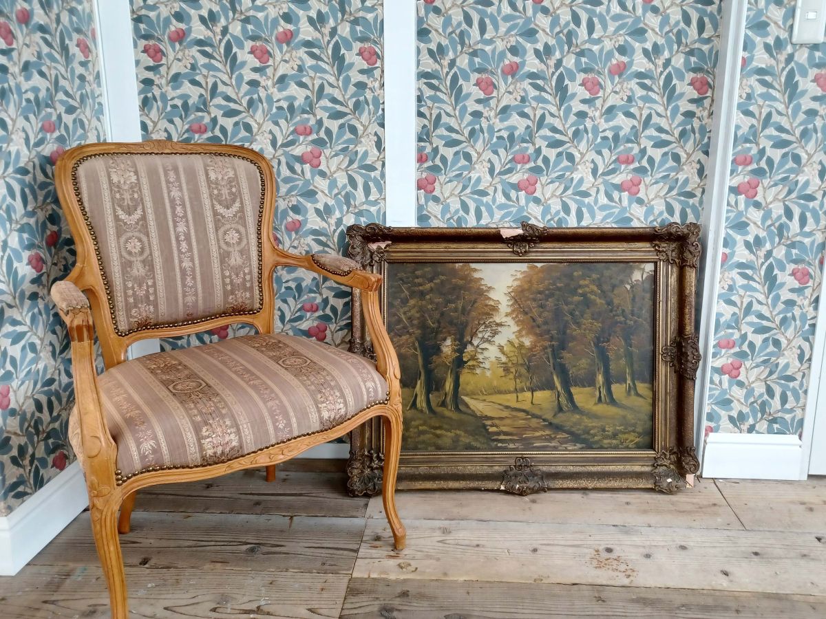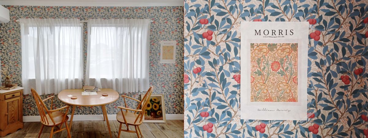 イギリスの人気デザイナー、ウイリアム・モリスの壁紙が一面に広がったコーナーは、ロマンティックでとってもかわいい! ポスターの植物模様も素敵ですよね。