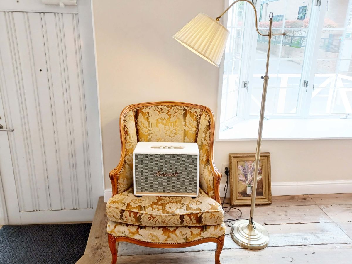 大きなマーシャル社製のスピーカーからは、洋風のジャズ系ミュージックが流れています。ヨーロッパの家族が自宅でまったり過ごす週末をイメージしたのだそう。