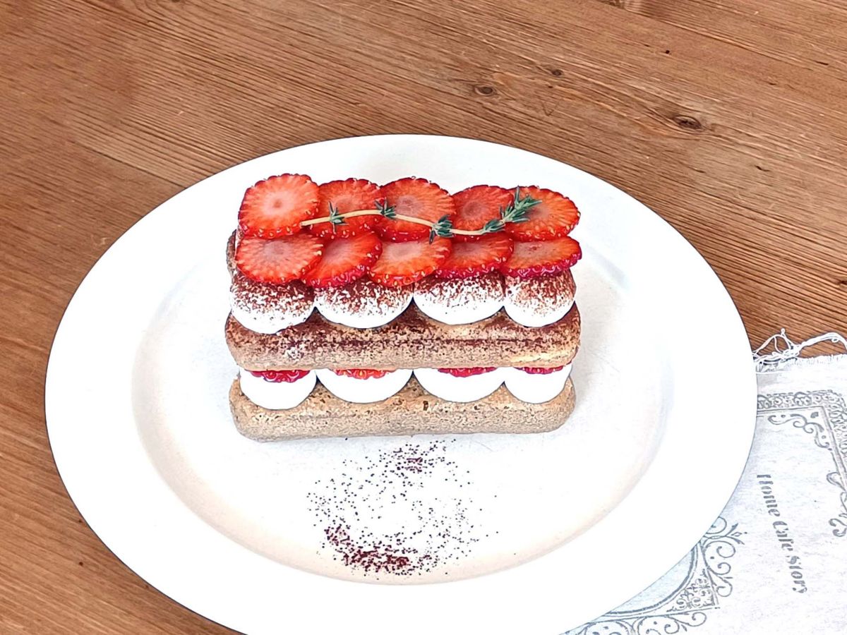 ビスケット生地にコーヒーを染み込ませた、外はしっとり、なかはさっくりの生地。そこにクリームチーズをベースにしたオリジナルクリームをたっぷり挟んだひと品。ほろ苦さとクリームのまろやかさに、イチゴの酸味が利いています。