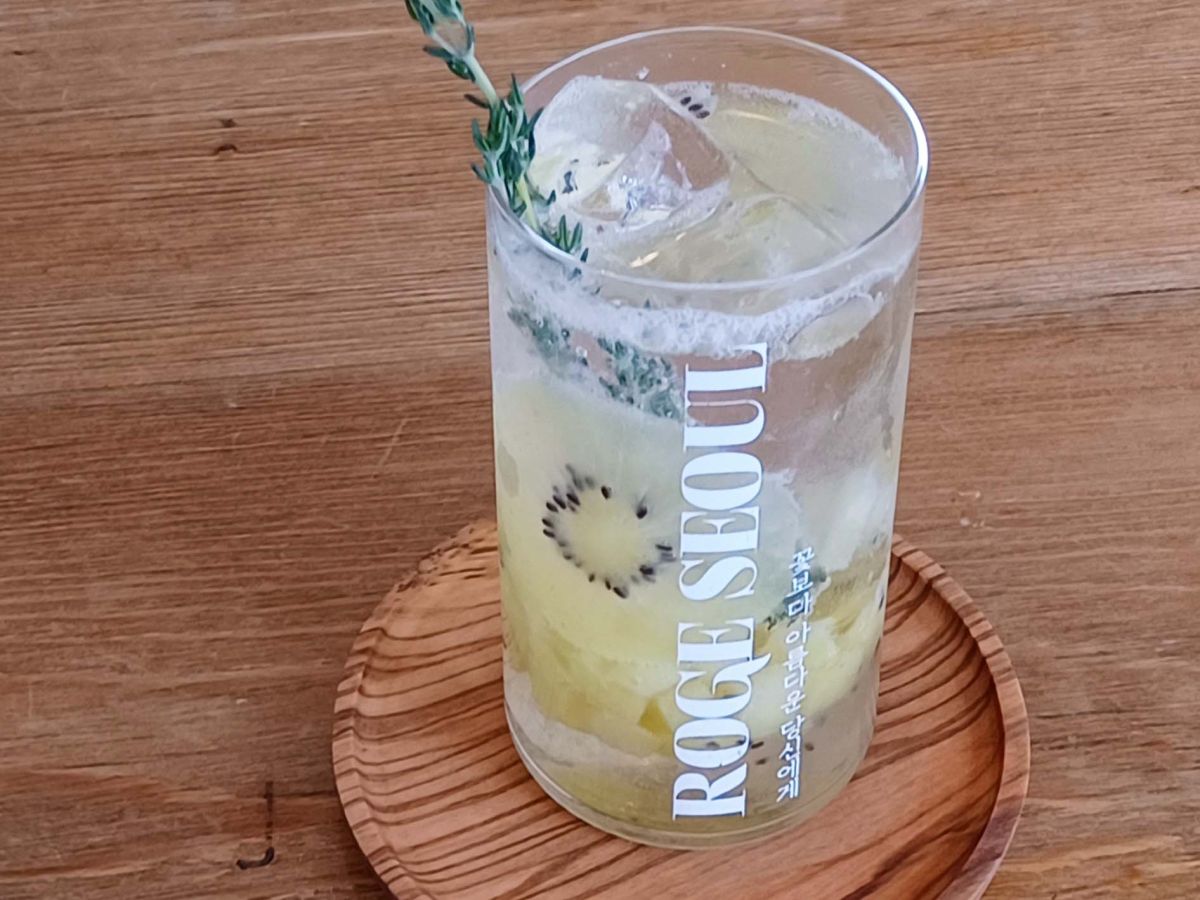 ゴールデンキウイがたくさん入っている炭酸ドリンクの「キウイエイド」は、見た目もさわやかでさっぱり。甘いスイーツにもぴったりです。
