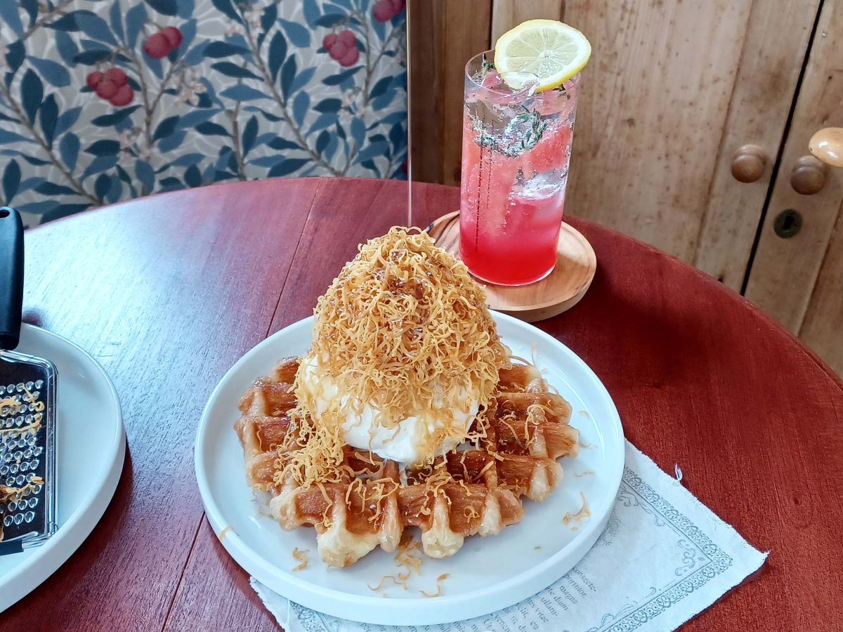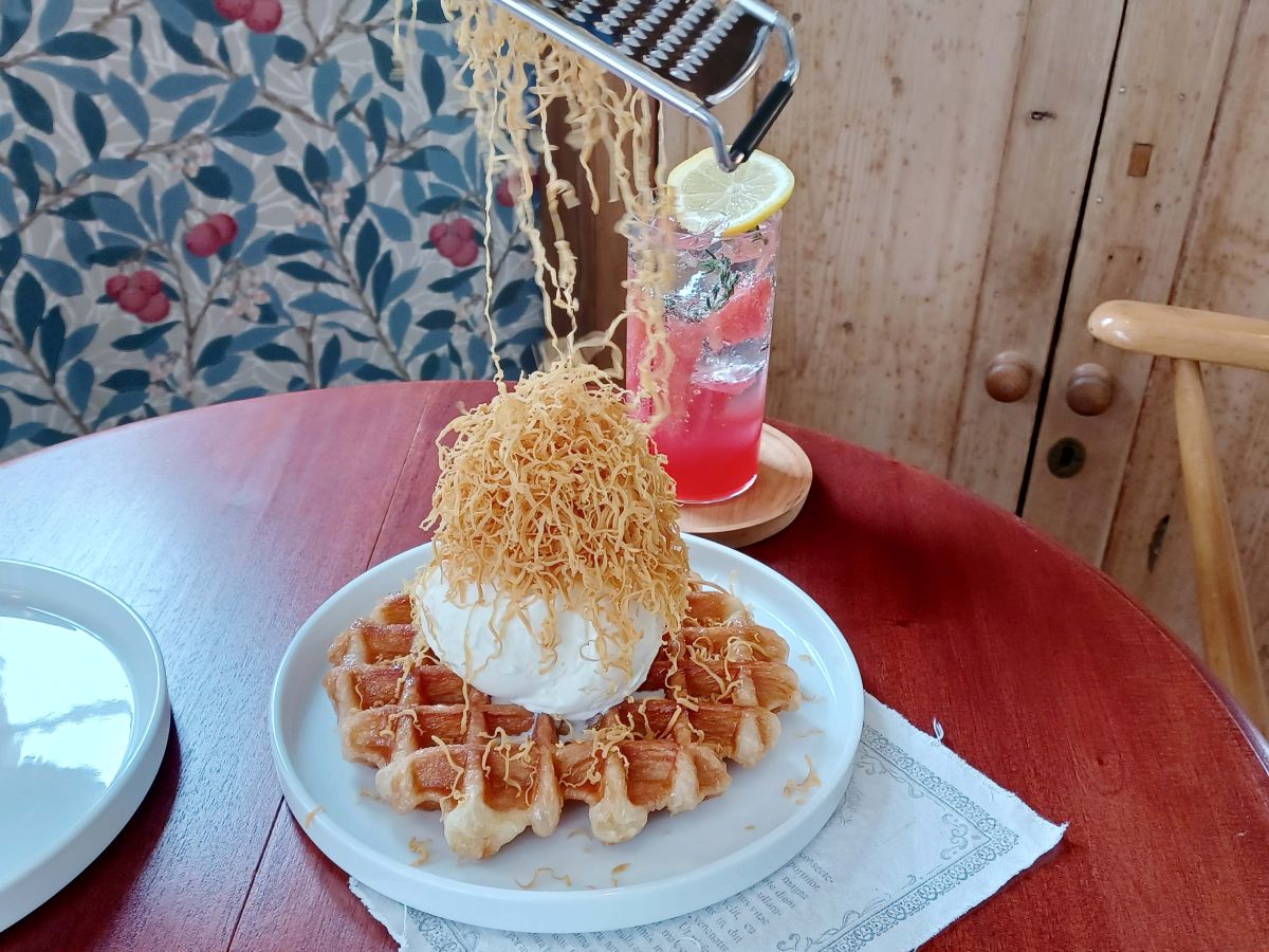こちらの「クロッフル」には、ノルウェー産のキャラメルチーズがトッピングされています。やさしい風味のミルクアイスに、キャラメルチーズの甘じょっぱさが絶妙にマッチ。