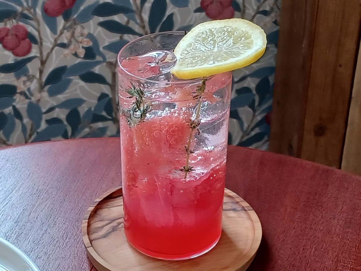 一方、ピンクグレープフルーツの果肉が入った炭酸ドリンクの「チャモンエイド」は、程よい酸味でスッキリした味わい。ドリンクのピンク色と、トッピングのレモンの黄色の組み合わせもかわいい!