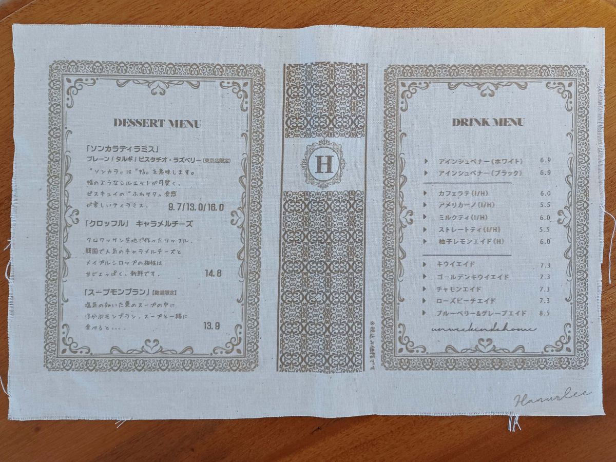 メニュー表を見てみると、なんと布で作られています!どのスイーツにしようか悩む前に、写真を撮ってしまいたくなるかわいさです。