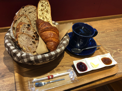 こちらは、パン4種とドリンク、ジャムがセットになった大人気のモーニングメニュー「朝のパンセット」。お目当てのバゲットはもちろん、デニッシュなどのヴィエノワズリー、ハードパンなどのなかから好きなものを選ぶことができます。