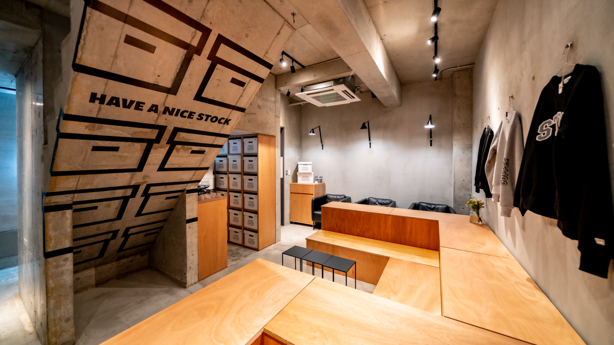 スツールが並ぶ1階のカウンターは14席、地下はフリースペースになっていて15人くらいはゆったりくつろげます。販売しているオリジナルブランドのアパレルグッズが、インテリアとして機能しているのもスタイリッシュ。ブラックのソファ席なども配されて秘密基地のようです。