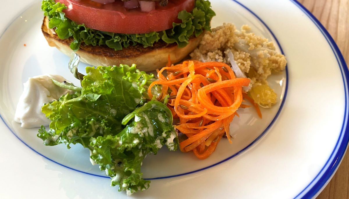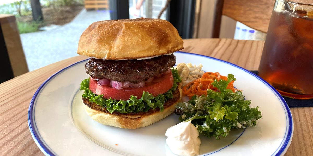 モーニングは自家製のジャムを添えたトーストやバナナブレッドなど、ブランチはサワードウや卵を使ったメニューを提供しています。この日はブランチの時間帯に伺って、「ハンバーガー」1540円を注文してみました。このハンバーガーは恵比寿や白金に店舗のある「バーガーマニア」の守口駿介氏が監修しています。