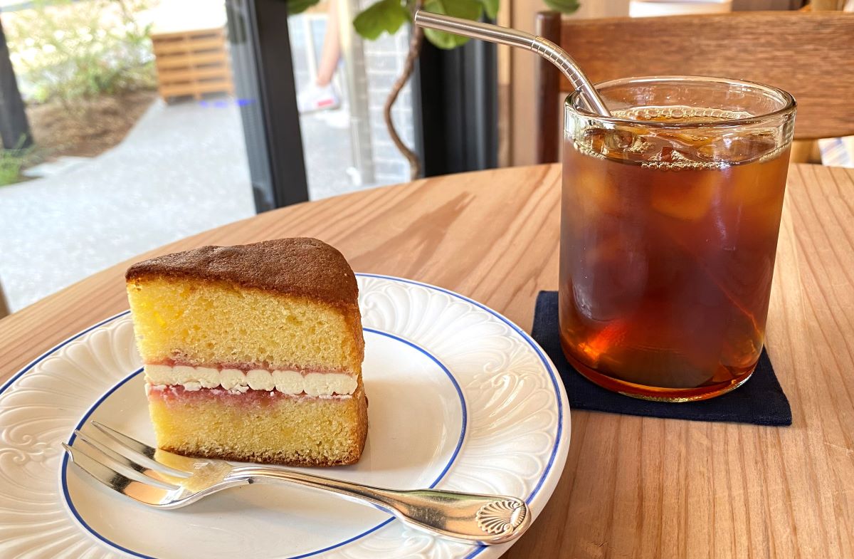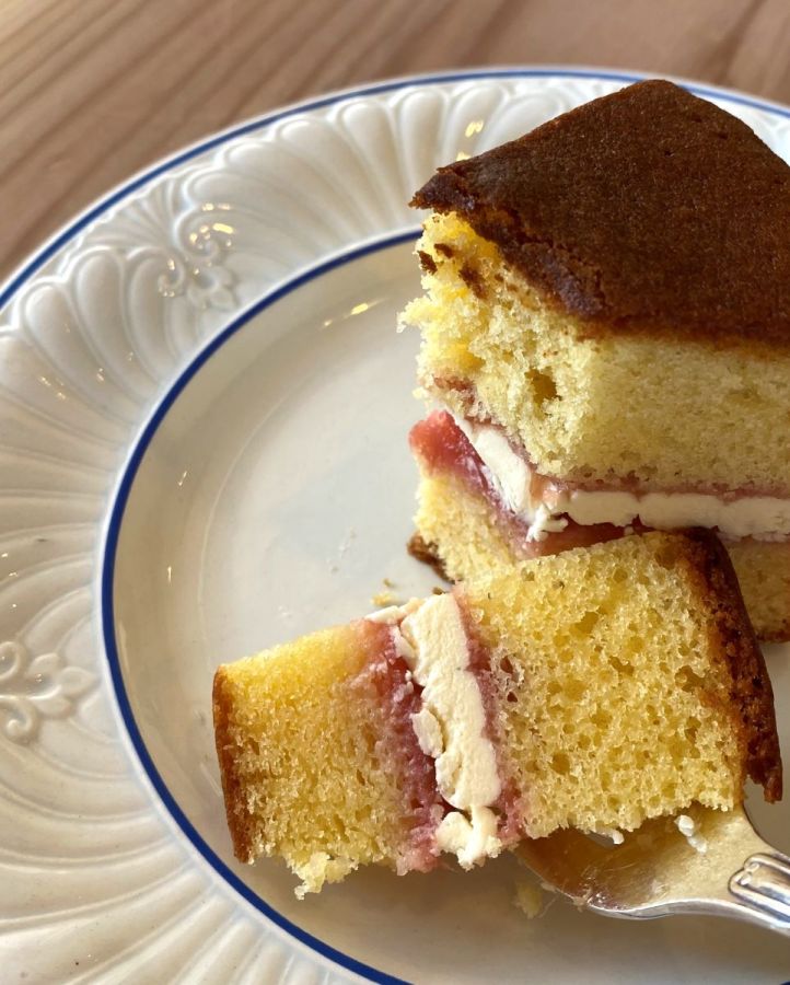 この日チョイスしたのは「ヴィクトリアサンドイッチ」638円。2枚のスポンジケーキの間にジャムを挟んだイギリス伝統のお菓子です。ルバーブのジャムと、バターとカスタードのクリームがサンドされていました。