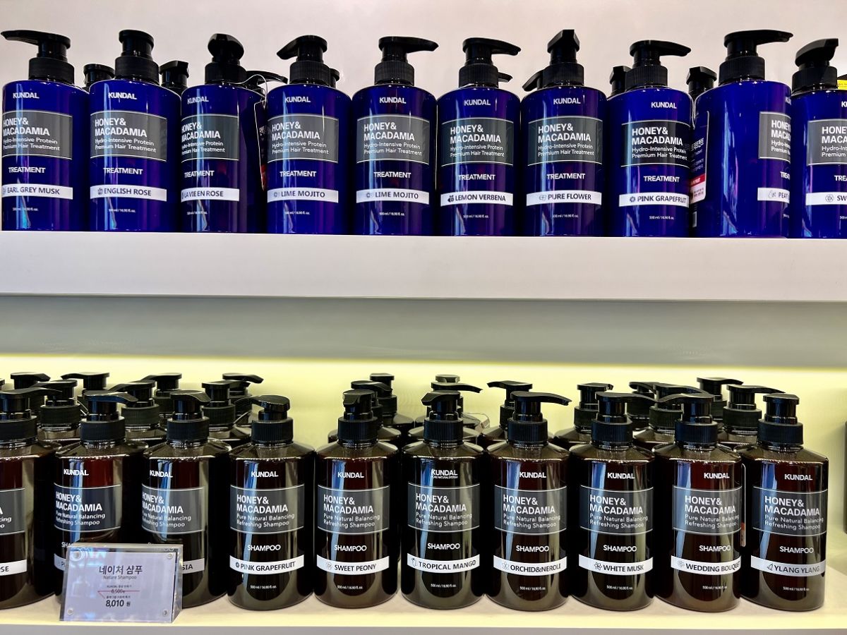 シグネチャーといえるのが、ノンシリコンのKUNDALハニー&マカダミアシャンプーとトリートメント。髪の毛に優しい成分が数十種類配合されていて、はちみつとマカダミア種子の抽出物がより潤いを与えてくれると大人気の商品です。それぞれの香りは、ホワイトムスク、チェリーブロッサム、ベビーパウダー、イランイラン、ピンクグレープフルーツの5種類。一番人気は、ベビーパウダーの香りということでした。シャンプーは500ml入りで8010ウォン、トリートメントは500mlで8550ウォンと、オンラインで購入するよりもショップの方が少しお得な設定になっています。