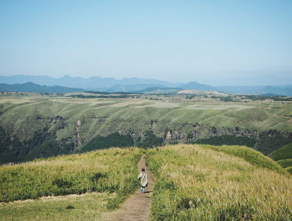 「記念写真」だと人物が主役ですが、あえて景色に溶け込むように人物を小さくすることで、大観峰の壮大さを伝えることもできます。
