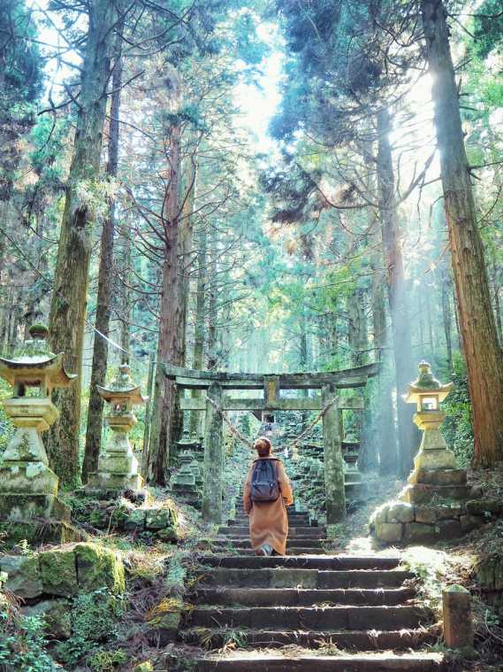 人気漫画の舞台になったことで人気に火がついた、上色見熊野座神社。パワースポットとしても知られています。自然に囲まれた静かな空気をかき分けるように、神殿へと続く長い長い階段を上って行くのは、まるで吸い込まれていくような神秘的な感覚です。