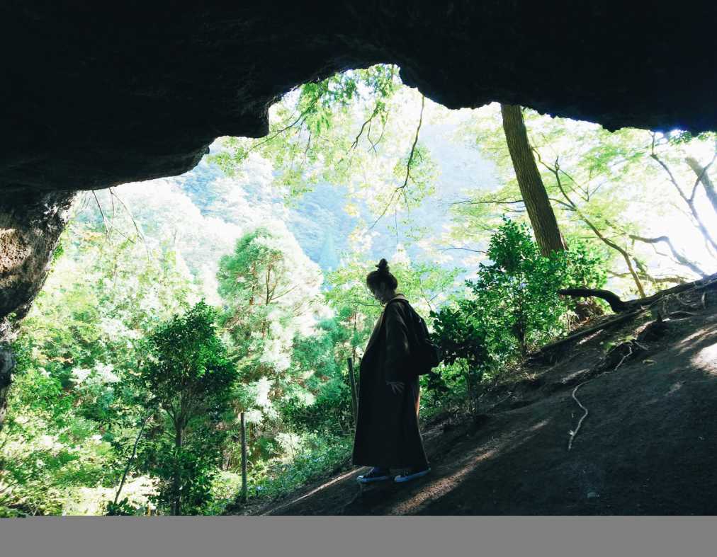 風穴の向こうには奥行きのある緑が広がっています。自然を背景に逆光を利用し、シルエットで大きな穴と人物がわかるようにすれば、神秘的で不思議な空気感のある写真に!