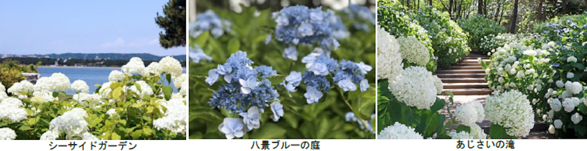 海に囲まれた八景島の島内には、さまざまな花が季節ごとに咲き誇ります。「八景島あじさい祭」が開催される2022年6月4日(土)~6月26日(日)は県内最大級の数を誇る約2万株のあじさいが見頃を迎える季節。「セイヨウアジサイ」や「ガクアジサイ」、八景島のオリジナルアジサイ「八景ブルー」など、色とりどりの「アジサイ」が咲き誇ります。