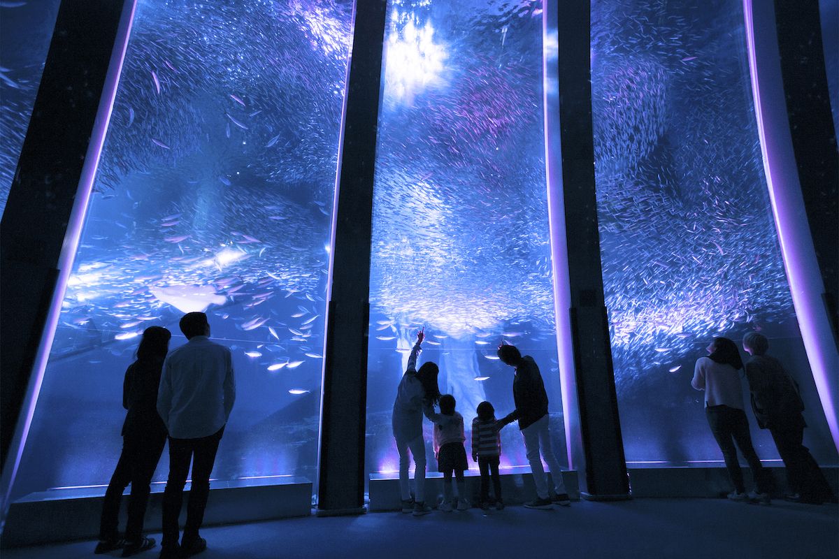 水族館「アクアミュージアム」にある高さ8m、水量1500tの大水槽「大海原に生きる群れと輝きの魚たち」では、国内最多飼育数5万尾のイワシが音楽や照明に合わせ乱舞する「スーパーイワシイリュージョン」を毎日開催。期間中の「スーパーイワシイリュージョン」は大水槽全体が五月雨やアジサイをイメージした青色や紫色の淡いライティングとなり、降りそそぐ雨のようにイワシがキラキラと輝く圧巻のショーです。