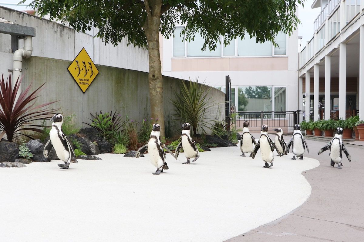 同じく「ふれあいラグーン」のアジサイが飾られたロードで見られるのは、ぺたぺたよちよちと歩く姿がキュートなケープペンギンたちのパレード。アジサイに興味津々なペンギンや逆走するペンギン、スタスタと我が道を行くペンギンなど、個性豊かなペンギンたちが目の前を一斉にパレードする姿は必見です。 パレードの後は、ケープペンギンとの記念撮影やふれあいができちゃいますよ。※画像は通常時の様子