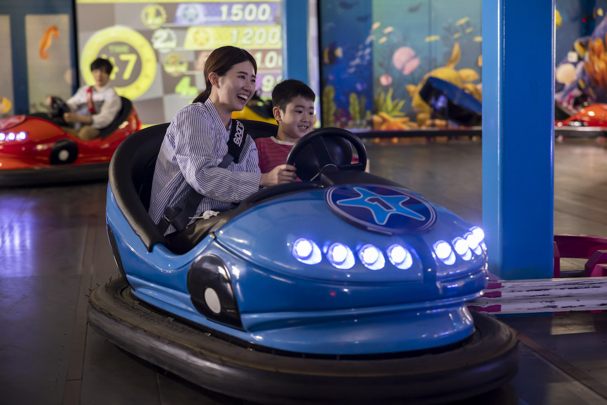 海底が舞台のカーアトラクション「マリンカート ファンタジア」もおすすめのスポット。2人乗りのカートに乗って、走行エリアに投影されるスターフィッシュを通過することで入手する得点を競う、全天候型カートアトラクションです。ハンドルを操作し、自分が乗っているカートと同じ色のスターフィッシュを通過すると得点アップ!おひとりでも、お友達とも楽しめますよ。