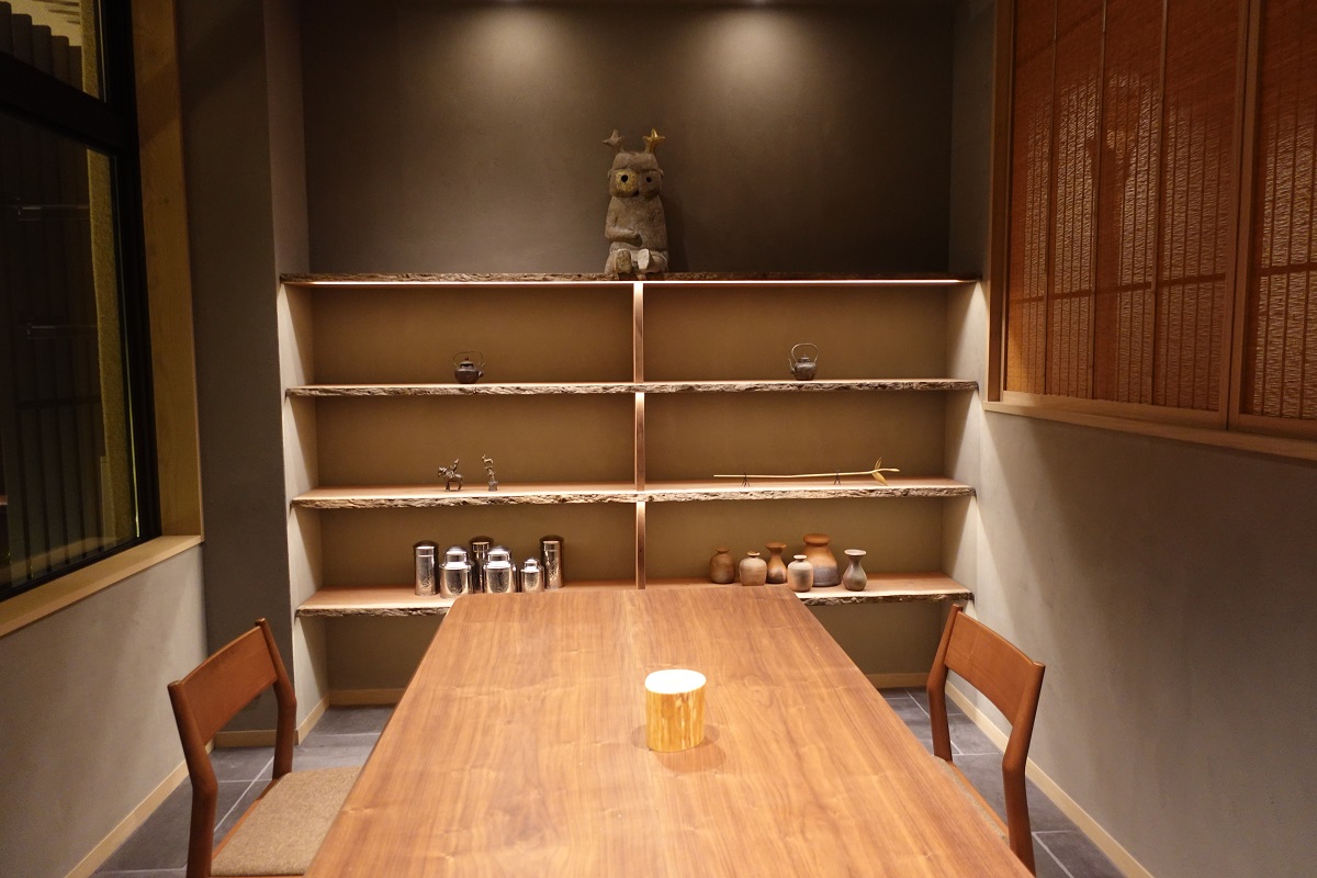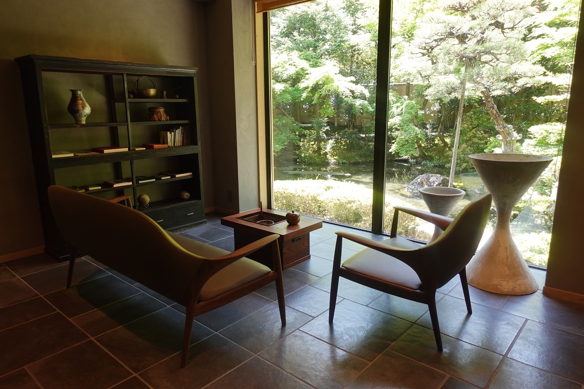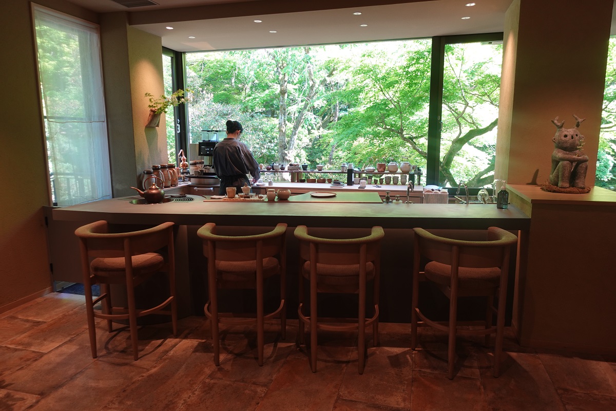 ロビーに一歩足を踏み入れた瞬間、窓一面に苔庭の景色が飛び込んできて、コンセプトどおりの空間に大興奮…!しかも、フロント横でお茶をいれてもらえると知り、チェックインを済ませた後、すぐにこちらのカウンター「帰去来(ききょらい)」へ。