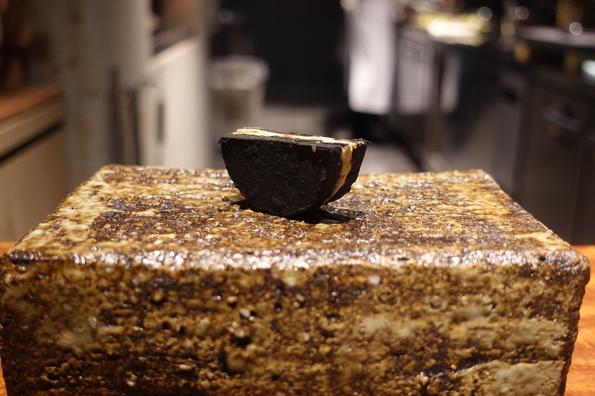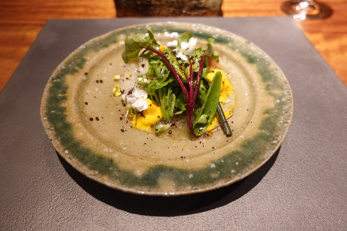 お料理は、前菜からデザートまでのコース形式。料理は時期により変わるそうですが、私がいただいたなかで特に印象に残ったものを紹介していきます。まずは2品目の、フォアグラとフキノトウのパテを、竹炭のサブレで挟んだもの。すべての素材の味がしっかりして、見事にそれがマッチしており、いくらでも食べられそうなくらい(笑)、おいしかったです。