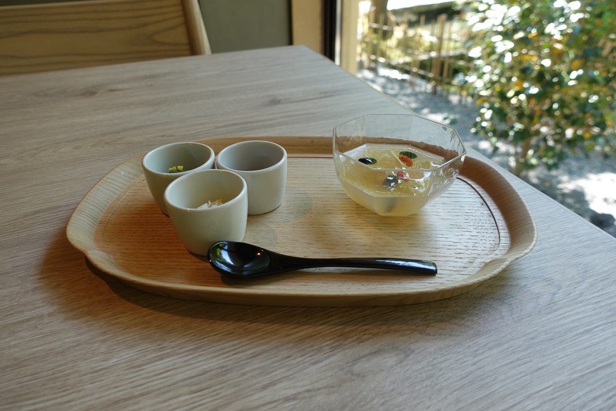 朝は、お宿おすすめの養生朝食を。湯葉と柚子の餡(あん)がかかったお粥と、副菜とオーギョーチという軽めのもので、前日食べ・飲みすぎた私(笑)には最適でした。(しっかり食べたい方は和・洋の朝食も選べますよ!)