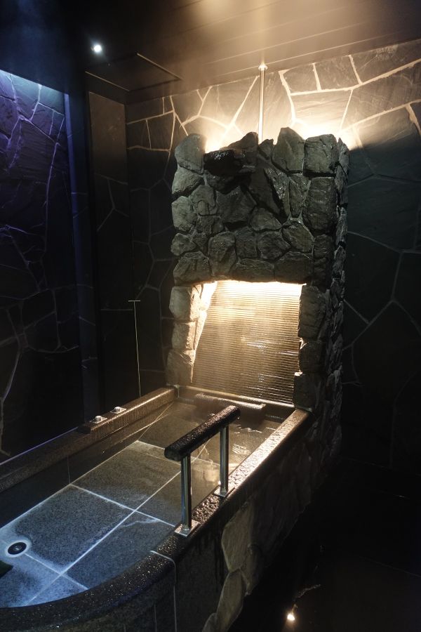 私は「炭蒸」を予約して行ってきたのですが、入った瞬間に、その広さと、炭化した薪をイメージしたという重厚な石があしらわれた空間美に圧倒されました…!