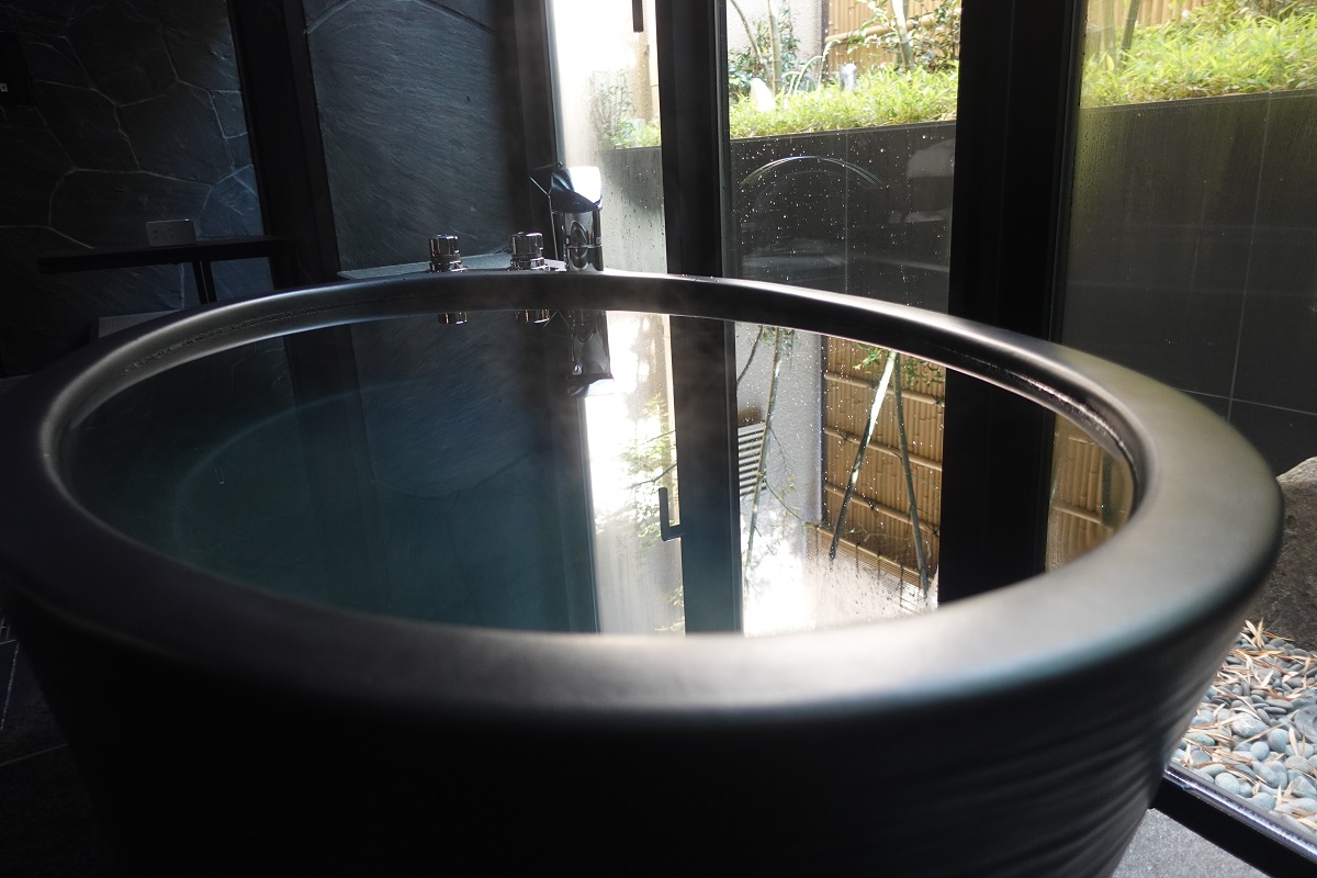サウナの中も、漆喰(しっくい)で墨色に塗られていて、かっこいい空間に。入口が小さく、体をくぐらせて入るのですが、この空間は“茶室”をイメージしているそう。妙に落ち着けたのは、そんな工夫にあったのかもしれません。