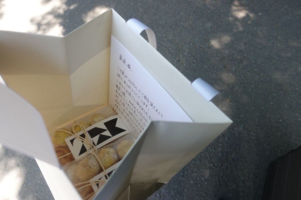 館内を少し散策していると、作品のアーティストの方のお話をしてくださったり、食事中も気にかけて話しかけてくださったり…とにかく温かい。写真は、私が何度もお菓子を絶賛していたら、スタッフの方が帰り際に渡してくださった素敵なお手紙とおみやげです。最後まで感動…しみました。(泣)