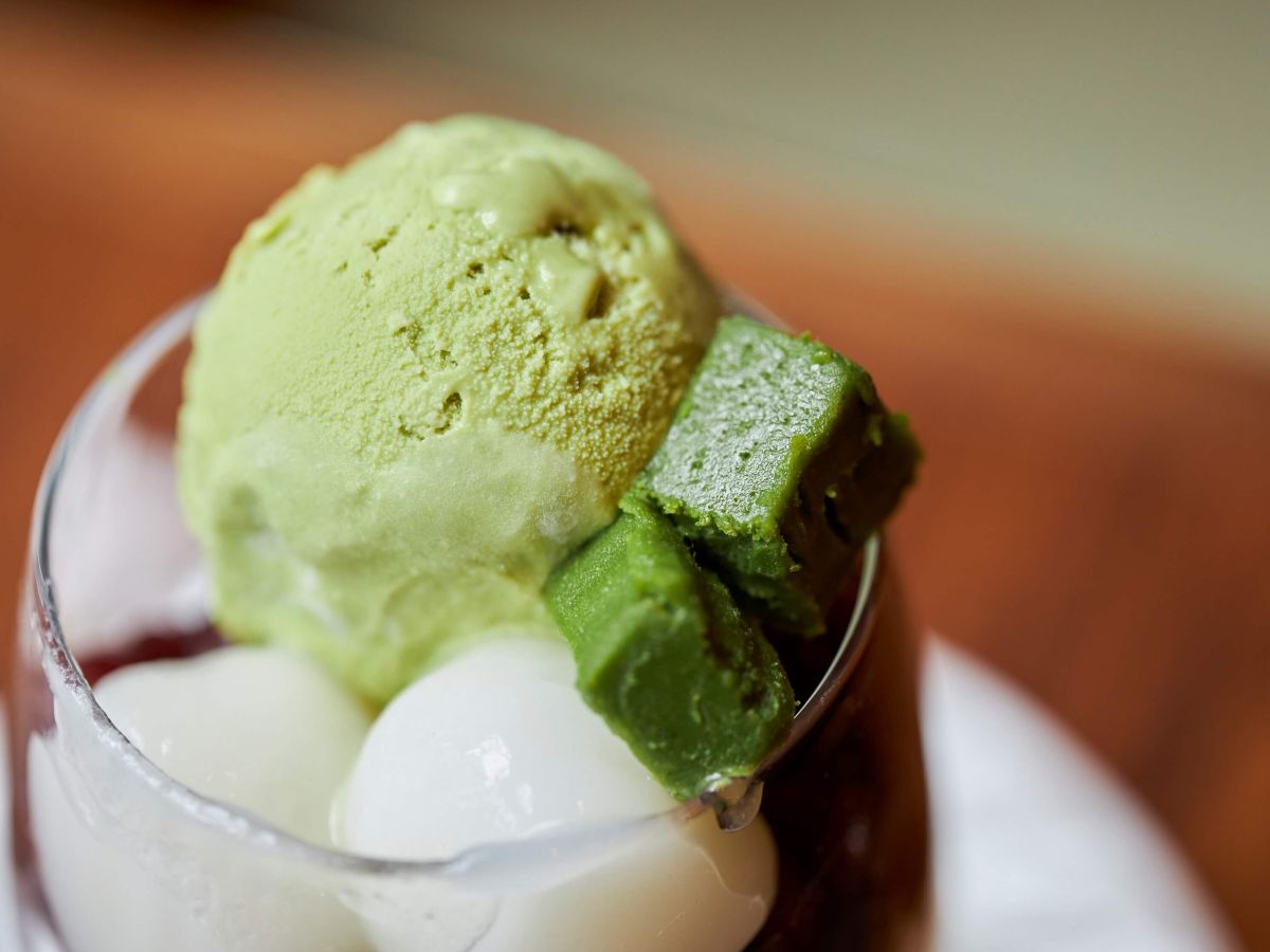 パフェの頂上に添えられているのは小さくカットした濃厚宇治抹茶テリーヌ。濃縮された抹茶の香りがいっぱいに広がり、白玉やアイスとの相性もばっちりです。