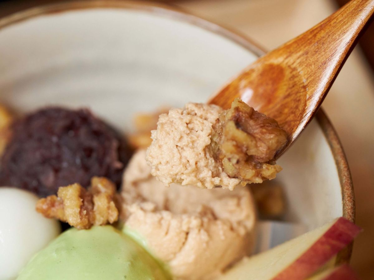 ふわふわ&なめらかな自家製のクルミムースも美味!炒ったクルミの塩味と香ばしさが、あんみつの素朴でやさしい味にベストマッチ!ほかでは味わえない「くるみ」ならではの絶品ハーモニーです。