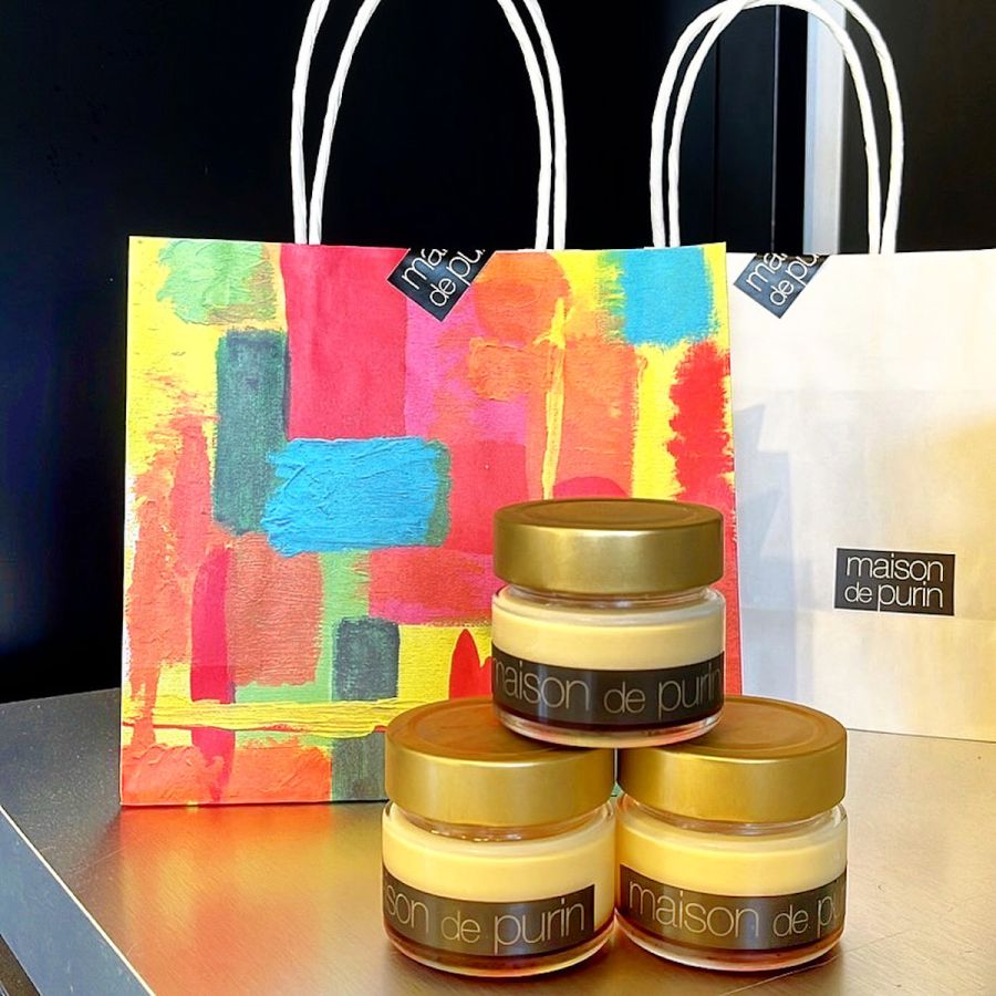 さらにスペシャルコラボレーションも実現。「maison de purin」の特徴である重層的な “マリアージュ” のイメージを、アーティストの鮎川陽子さんが魅力的な1枚のアートに落としこみました。実際に試食をしたときの印象をもとに、鮎川さんがその自由な感性で描き下ろした作品を、「maison de purin」ではショッパーとして採用しています。持ち運びの際もテンションが上がりそうですね。