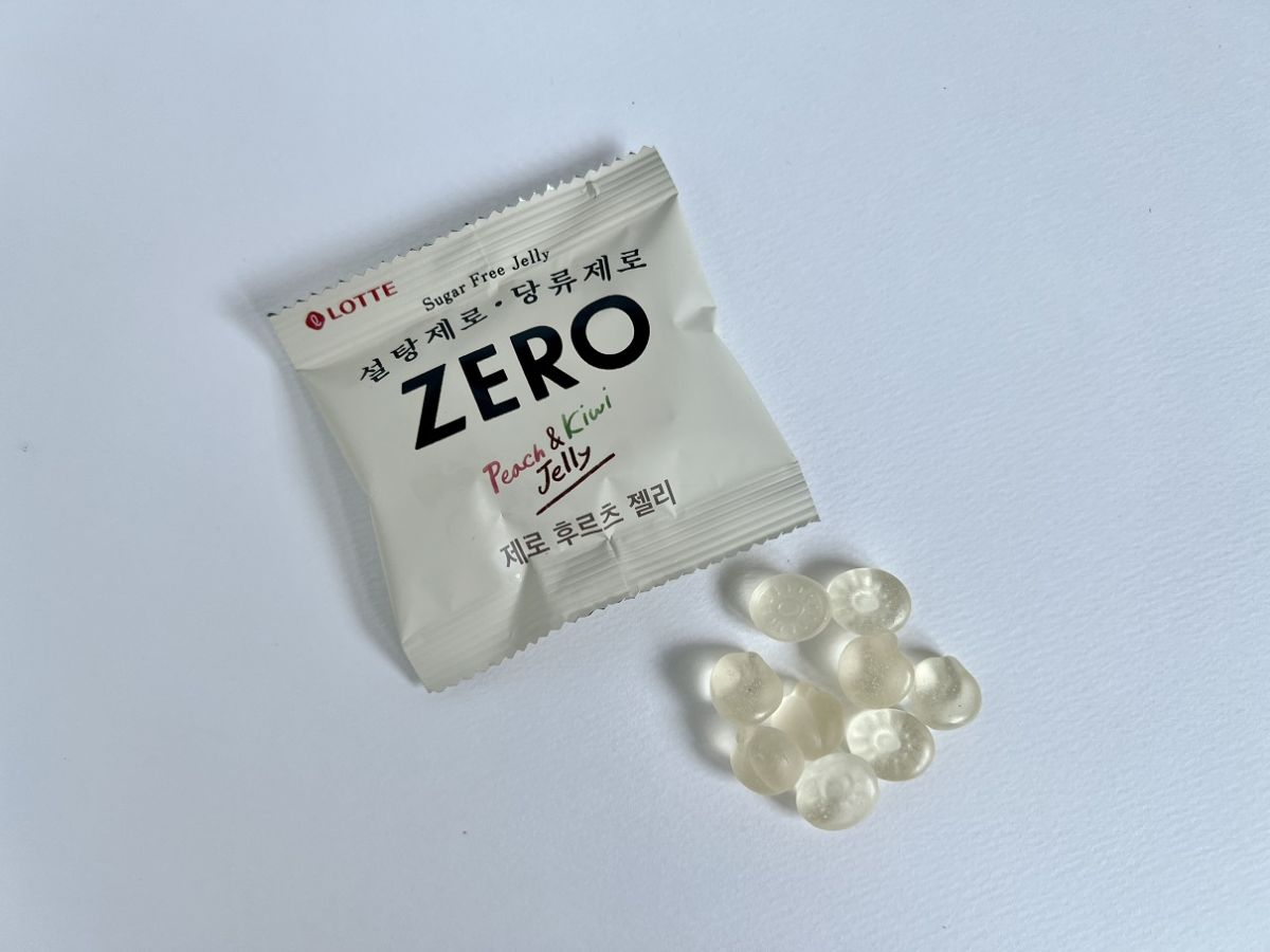 糖質ゼロのゼリーで、キウイと桃フレーバーの2つの味が同じ袋に入っています。それぞれフルーツの形になっているのもかわいい。ゼリーが透明なのは糖質だけでなく着色料もゼロにして、ダイエット中の方だけではなく、子どもへも安心して食べさせることができる商品にしたのだとか。1袋30カロリー。