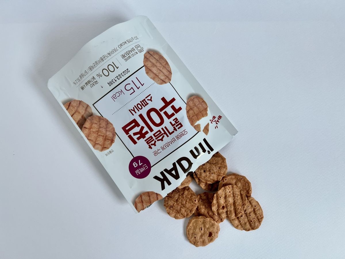 こちらの商品はなんと、鶏のささみからできているチップス。「アイムダック」という、韓国でダイエットしている人のほとんどは知っているダイエット食品のブランドから出ているおやつです。1袋115カロリーで7グラムのたんぱく質が摂取でき、ダイエット中にも気兼ねなく食べられる優秀なおやつ。少しスパイシーさがあり、もっともっとと食べてしまいたくなりますが、ダイエッターには欠かせないおやつとして知られています。