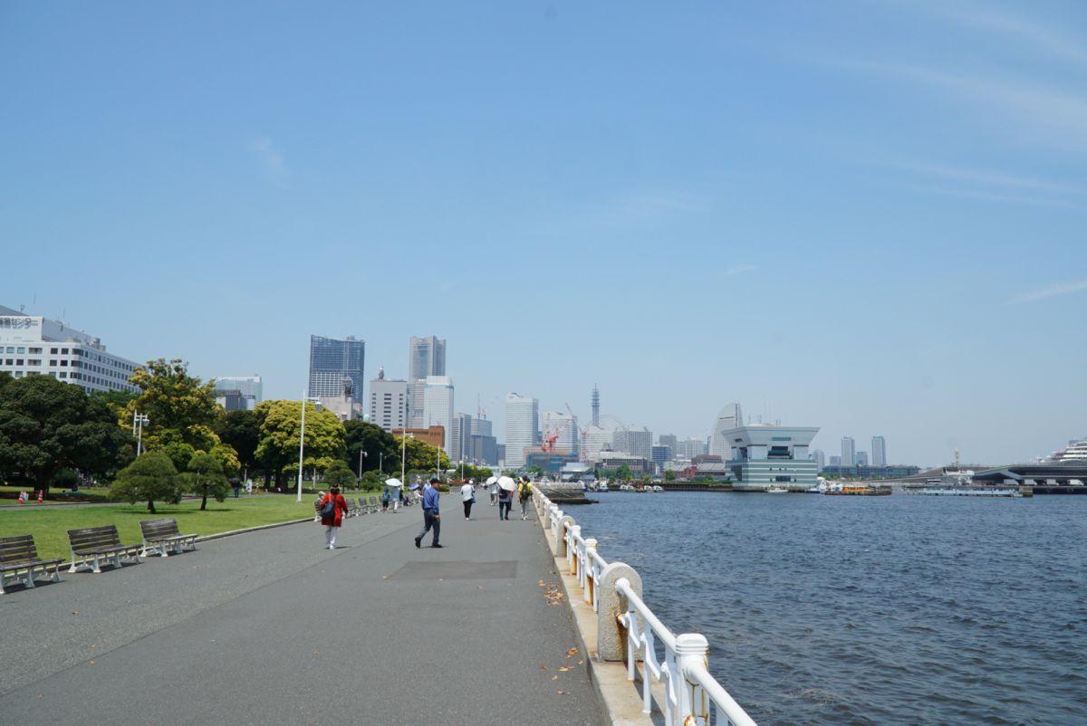 園内は西はみなとみらい方向へ、東は山手・元町方向へと海に沿うよう横長に延び、その長さは約700m。海沿いを歩くだけで、心地いい風を感じられる広々とした臨海公園です。