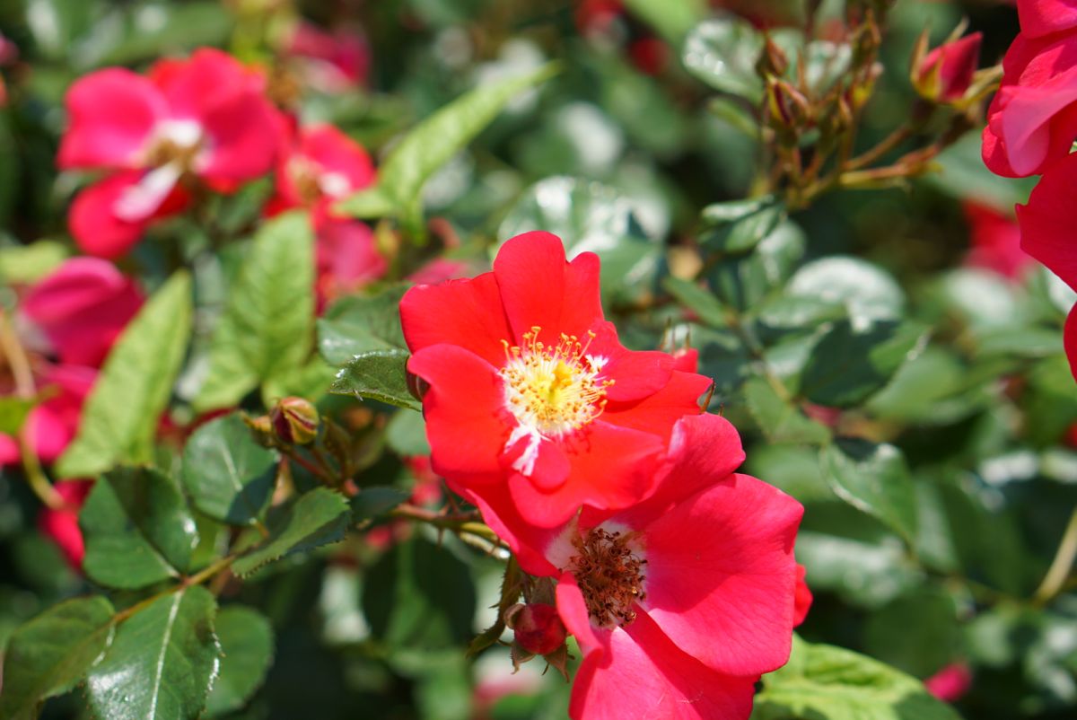 こちらの真っ赤なバラは「キャンディア・メイディランド」。日本のイノバラのように5cm以下の小輪の花を咲かせるのが特徴。これもバラなの?と思ってしまうほど種類が豊富で、見ていて飽きません。